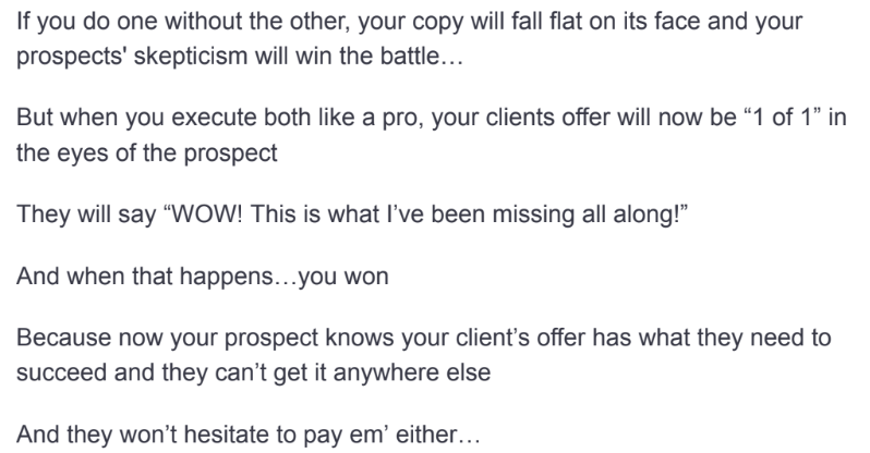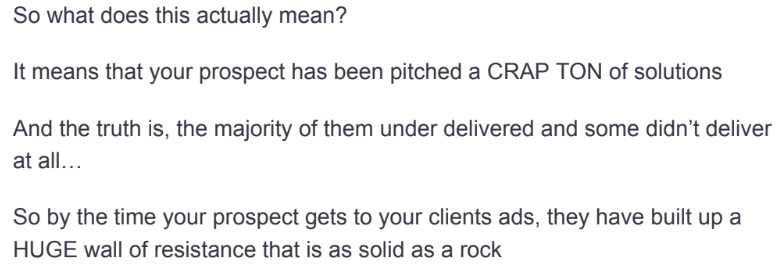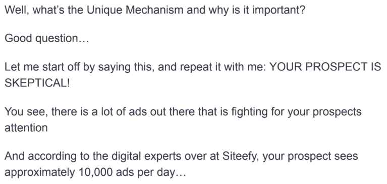 I leverage a credible source with statistical proof to back up my claim that prospects are skeptical. This foundation is going to help the reader understand why the unique mechanism is important and why they need to learn it.