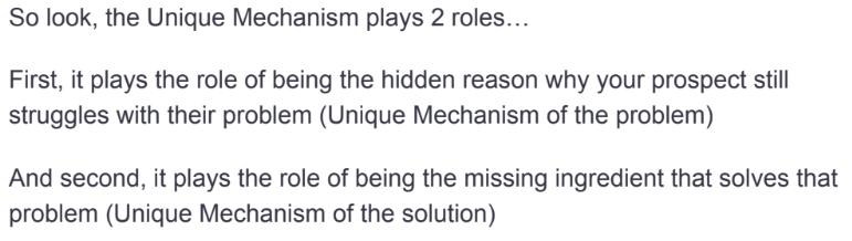 The goal of this email is to educate and sell the prospect on the idea of the unique mechanism in copywriting. I inform the prospect on why unique mechanisms are important and how it will benefit them as a copywriter.
