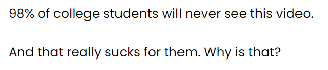 They don’t want to end up being a broke college grad with tons of debt so this claim is going to add on more tension to that sense of urgency to watch the video.