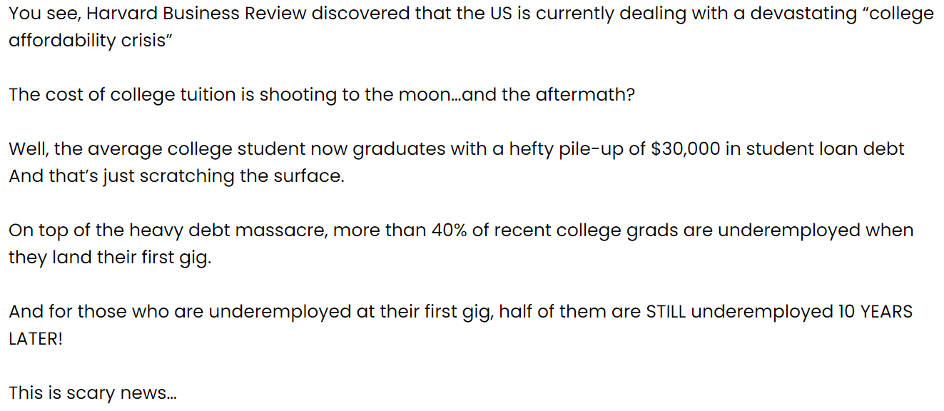 "So don’t wait, because as more and more college students discover this goldmine, the harder and harder it’s going to be for you to become successful
