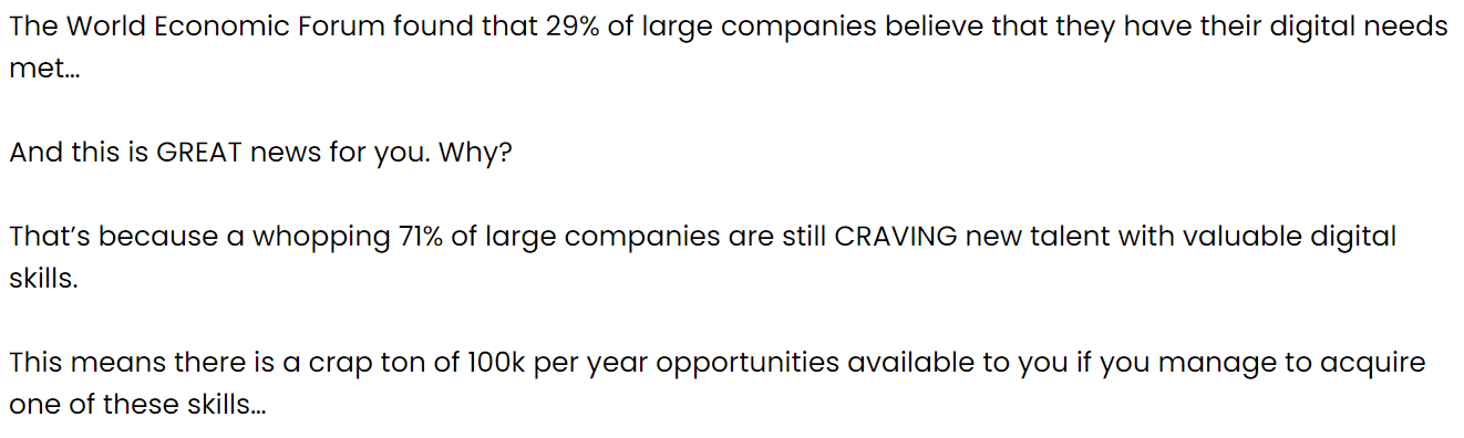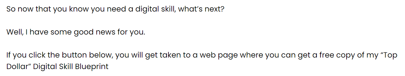 The prospect most likely isn’t aware of copywriting so copywriting is not mentioned during the first 2 steps of the funnel. It is framed as a “digital skill”. I got this idea from a article I found during research from an organization called Harvard Business Review.