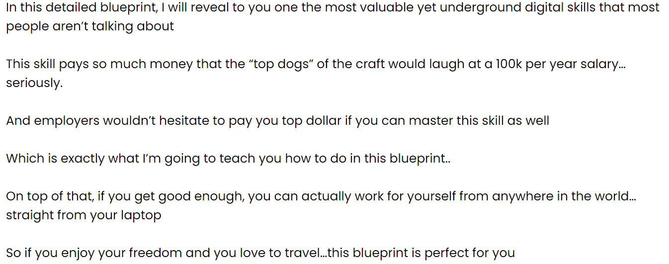 This blueprint is about copywriting and it goes in-depth on why copywriting is a valuable skill that college students can learn and leverage in the digital economy to make great money.